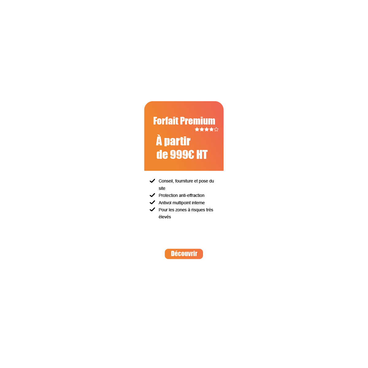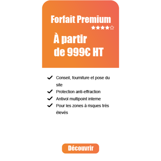 Les produits du forfait Premium sont adaptés à une zone à risques très élevés. Si vous recherchez une protection contre le vol et l’effraction, nous vous conseillons le forfait Premium+.